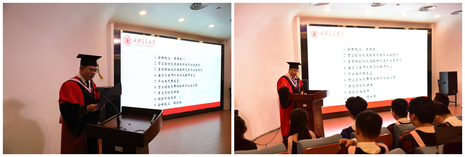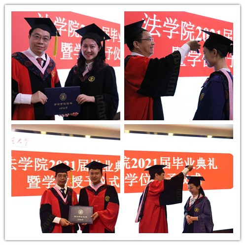 颁授学位证书环节,在轻松愉快的《毕业歌》的歌声中,单文华院长和王保民书记为全体毕业生逐一颁授学位证书并合影留念。