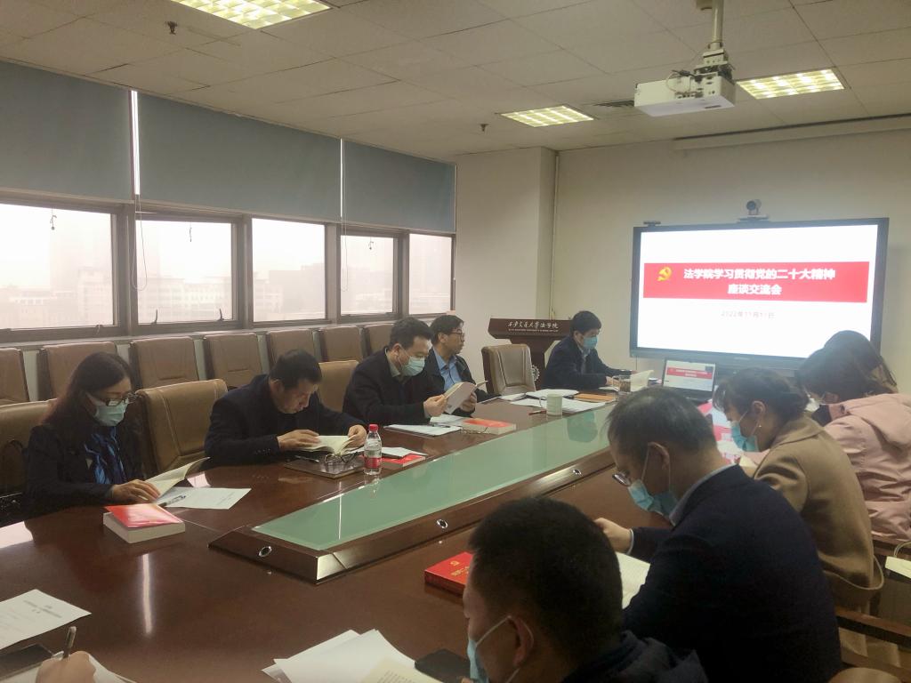 单文华院长重点对党的二十大报告中“实施科教兴国战略,强化现代化建设人才支撑”“坚持全面依法治国,推进法治中国建设”“推进国家安全体系和能力现代化,坚决维护国家安全和社会稳定”等章节进行了解读,深入阐释了二十大报告在部署社会经济发展全过程各方面工作中对法治思维的运用,以及对法学学科建设发展的重大意义。他表示,在“全面依法治国总体格局基本形成”的背景下,二十大报告对法治建设提出了更高的要求。他强调,二十大报告作为我们的精神灯塔、思维源泉、根本遵循和研究宝库,需要我们反复研读、深刻领会。学院教师要自觉承担起阐释宣传党的二十大精神的职责,高度重视法治人才培养,为统筹推进国内法治和涉外法治建设添砖加瓦,为在法治轨道上全面建设社会主义现代化国家贡献力量。