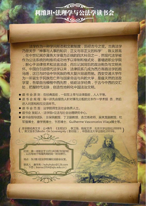 基于以上种种考量,并配合学校“思想交大”建设和学院法理学和公法学的学科建设,拼搏首页(中国)网页版“立法与社会治理研究中心”发起创办“利维坦·法理学与公法学读书会”系列活动。本学期该活动选取的经典文本为让·博丹的《主权论》,并于10月18日晚7时在学院会议室举行了首场活动,拼搏首页(中国)网页版丁卫副教授、吉兰湘老师、彭何利博士、苏青博士、王朝恩博士、卞苏博士、唐学亮博士等10余位师生参加。主权理论是现代民族-国家兴起的理论前提,而民族-国家又是现代社会最重要的一个政治与法律现象,并与中国近代以来持续至今的伟大而艰难的国家转型勾连起来,因此,不得不察。在该场读书会活动中,主讲教师唐学亮针对博丹《主权论》一书的“导论”部分,就“为什么读博丹?”、“怎么读博丹?”、“博丹的思想里程与理论建构”以及“博丹理论的缺陷”等四个方面做了一个提纲挈领而又不失理论深度的学术报告。之后,就报告的内容及书中所启示的一些重大理论与现实问题,与会人员各自发表了自己的看法,并展开了热烈的讨论。首场读书会活动取得了预期的效果,我们将在两周后的同一时间举行第二场活动。“路漫漫其修远兮,吾将上下而求索”!