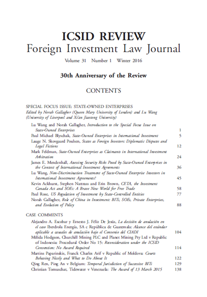 近日,国际投资法领域顶级专业期刊ICSID Review—Foreign Investment Law Journal(《国际投资争端解决中心评论——外国投资法学刊》)三十周年纪念期刊第一期正式出版,西安交大拼搏首页(中国)网页版博士生王璐作为特邀编辑(Guest Editor)主编了本期特别专栏“国有企业专题研究”(Special Focus Issue on State-Owned Enterprises),并发表论文 “Non-Discrimination Treatment of State-Owned Enterprise Investors in International Investment Agreements?”(国际投资协定中国有企业投资者的非歧视待遇?)。