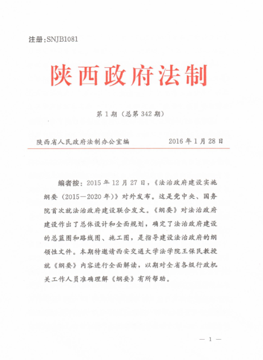 2015年12月27日,《法治政府建设实施纲要(2015-2020年)》对外发布。陕西省人民政府法制办公室邀请了拼搏拼搏首页(中国)网页版(中国)网页版拼搏首页(中国)网页版王保民教授就《纲要》内容进行了全面解读,解读内容被采纳报省领导,送省属各机关,省法院、检察院,各市、县(区)人民政府,发各级政府法治工作机构,以期对全省各级行政机关工作人员准确理解《纲要》有所帮助。