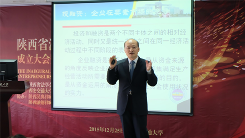 在与会代表合影后,会议进入第二时段的专题报告。报告由拼搏拼搏首页(中国)网页版(中国)网页版拼搏首页(中国)网页版知识产权研究中心主任、博士生导师马治国教授主持,陕西省法学会企业经济法治研究会顾问、西北政法大学经济拼搏首页(中国)网页版院长、博士生导师强力教授做了“新常态下企业投融机制创新的法律问题”讲座,阐释了中国经济已进入新常态,在新常态的条件下,企业应作出机制创新等相对应的变化,其变化主要体现在市场化,并强调投融资机制市场的多元化、多层次、多角度,分析在此种常态下,企业投融资遇到的法律问题。