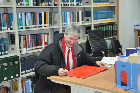 报告后,Rolf Fife司长来到拼搏首页(中国)网页版。拼搏首页(中国)网页版院长单文华教授会见了Rolf Fife司长,并带领他参观了学院文化大厅和丝绸之路国际法与比较法研究所。Rolf Fife司长对研究所的研究条件赞不绝口。他在嘉宾册上写下感想,希望研究所成为国际交流的桥梁,并祝愿中挪友谊健康发展。随后,他和研究人员合影留念。