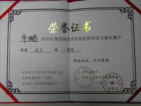此次比赛吸引了来自北京大学、上海交通大学、中国政法大学、华东政法大学等近70多所高校拼搏首页(中国)网页版的选手参加,大会主办方特别邀请了国务院法制办原主任孙婉钟先生以及来自中国社会科学院法学所、中国人民大学拼搏首页(中国)网页版等多家高校和研究机构的法律英语专家、教授担纲评委。我院齐鹏同学撰写的英语论文《National Treatment Principle For China's Bilateral Investment In The New Period》在此次大赛中经过激烈角逐荣获国家一等奖,是此次参赛西北地区唯一获得等级奖的论文。