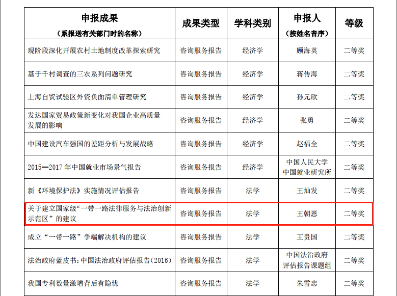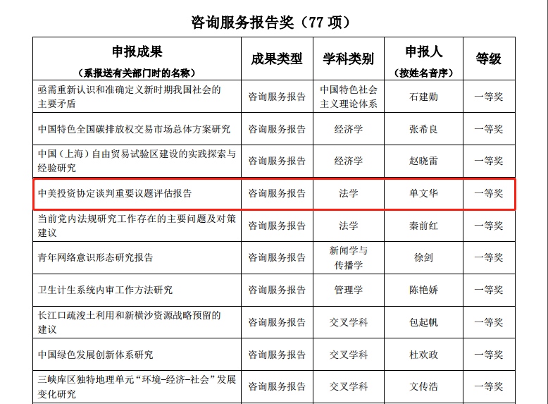 其中,拼搏首页(中国)网页版院长单文华教授主持撰写的《中美投资协定谈判重要议题评估报告》荣获咨询服务报告类一等奖——这是该类型全国仅有的两项法学类一等奖获奖成果之一,也是西安交大在该奖项一等奖上的首次突破。同时,由单文华院长和王朝恩副教授等合作撰写的《关于建立国家级“一带一路法律服务与法治创新示范区”的建议》荣获咨询服务报告类二等奖,是全国5项法学类二等奖成果之一。