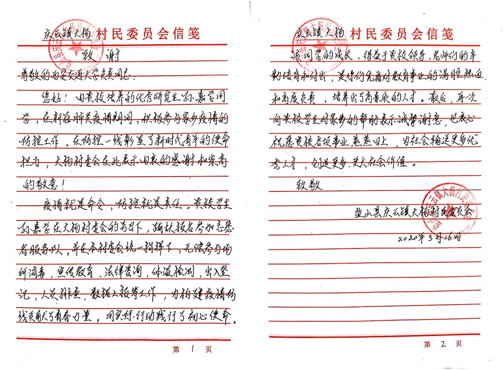 近日,一封特殊的来信悄然落至交大。西交拼搏首页(中国)网页版学生——孙嘉学在家乡疫情防控攻坚战中不仅身体力行做好各项基础工作,更发挥自身专业为群众普及相关法律知识,为控制疫情贡献青春力量。庆云镇大杨村特向拼搏拼搏首页(中国)网页版(中国)网页版邮寄了一封手写感谢信,字里行间饱含对交大领导、老师的真挚谢意。