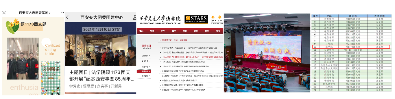 团员积极参加支部、学院、学校各项活动,支部活动参与率达95%以上,2021年度“最佳团日”活动,支部成员全员参加,开展参观科技展馆、“劳动志愿服务包干”、“民族一家亲”座谈会、读书会等活动;2021年12月4日,全员参加学院“宪法日”宣传活动,联合法医学院开展“普法微课堂”,结合学科特学进行普法宣传,加强师生法律意识。科技创新方面,成员积极参加科技创新活动,参加校辩论赛、一支队伍入选“腾飞杯”校赛,成员参加拼搏拼搏首页(中国)网页版(中国)网页版首届提案模拟大赛,正在比赛环节。文体活动方面,多人参加校迎新晚会、“中华之声”合唱比赛,消防运动会等活动。